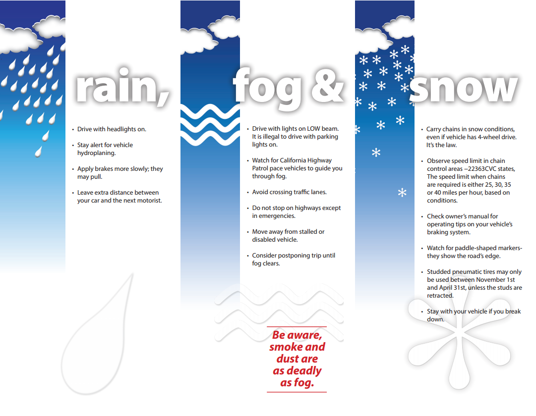 Check out their brochure (front and back) on safe driving tips for rain, fog, and snow.